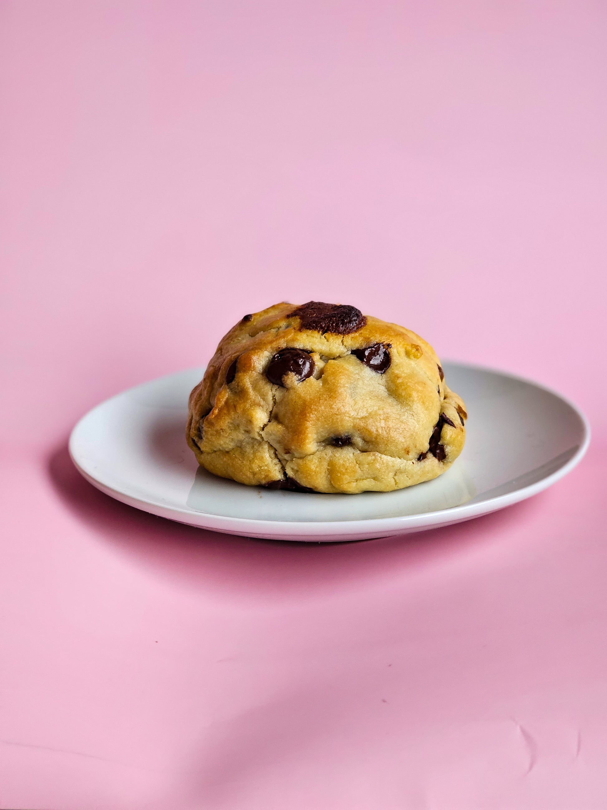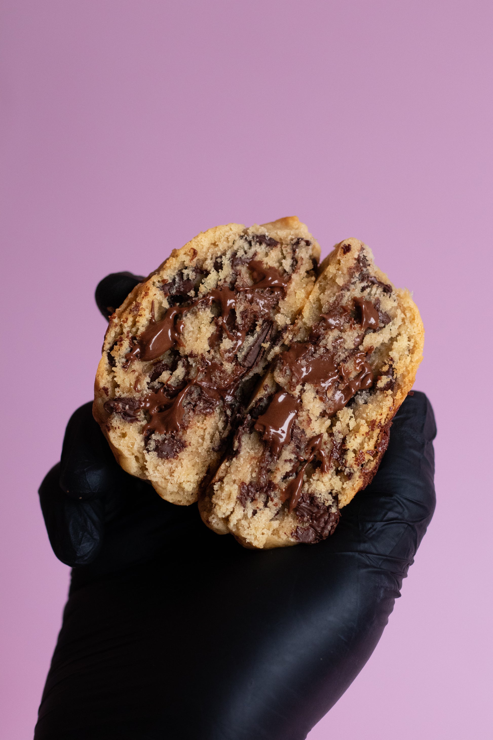 Cookie croustillant aux pépites de chocolat noir et au coeur tendre et moelleux de pâte à tartiner noisette.